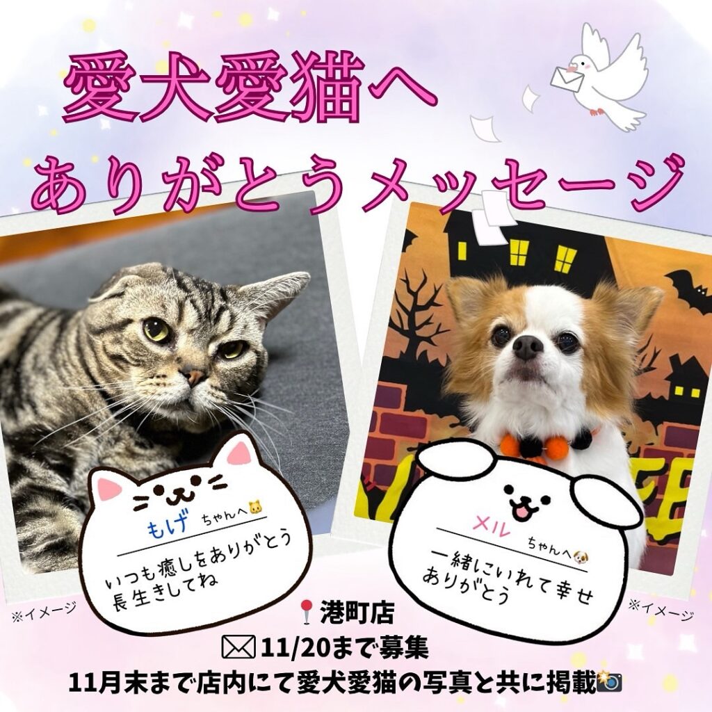 11/20までにご来店された方皆様にメッセージカードをお渡しします!メッセージカードを再度持ってきていただけると、愛犬愛猫の写真と共に店内に飾ります🐶🐱📝