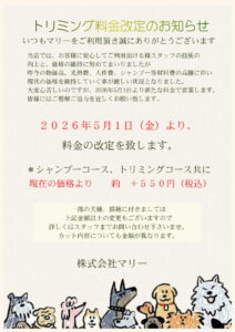 トリミング料金値上がりのお知らせ
